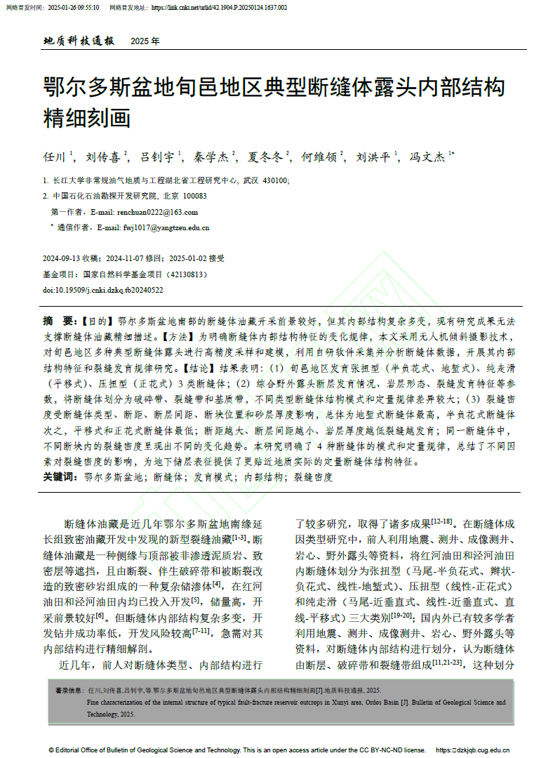 060net永利研究生任川在期刊《地质科技通报》上发表题为“鄂尔多斯盆地旬邑地区典型断缝体露头内部结构精细刻画”的研究论文。永利官网非常规油气地质与工程湖北省工程研究中心为论文第一署名单位,冯文杰副教授为通讯作者。