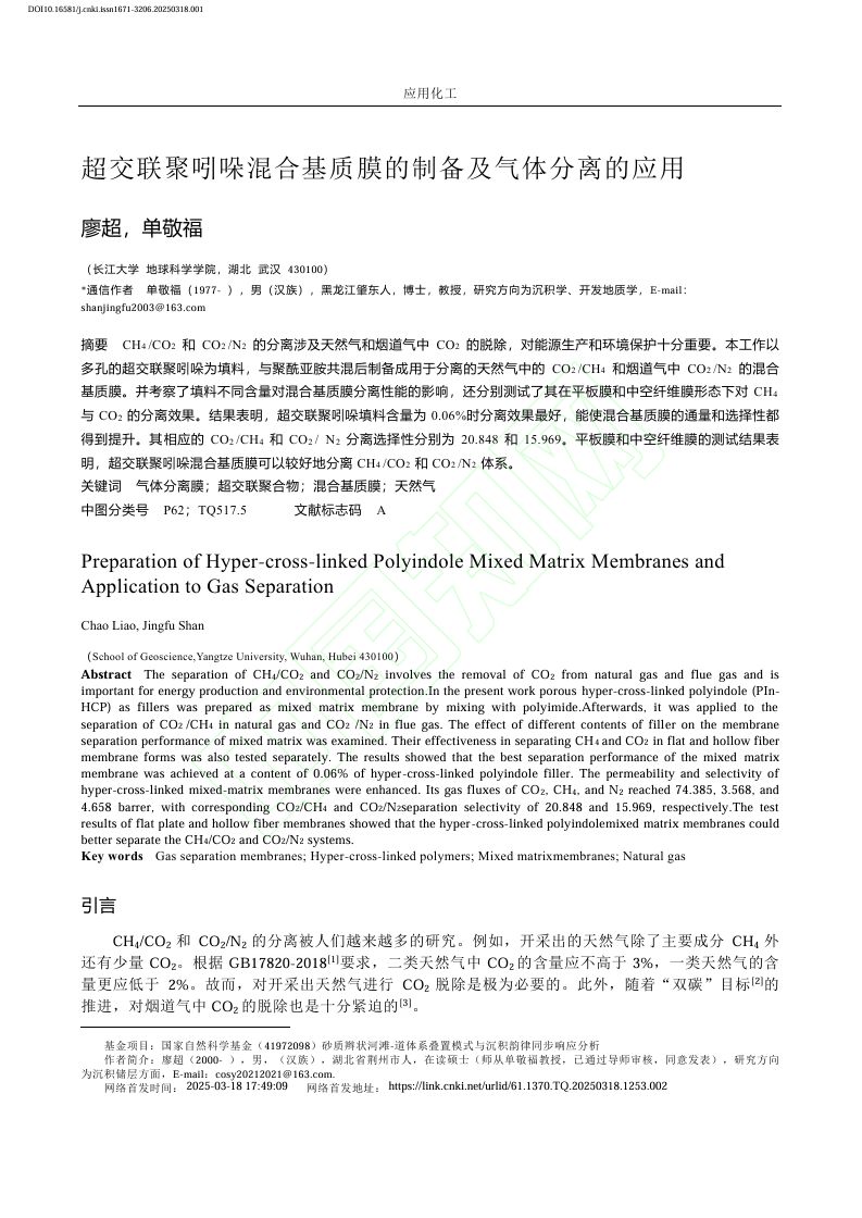 近日,060net永利硕士生廖超在中文核心期刊《应用化工》上发表题为“超交联聚吲哚混合基质膜的制备及气体分离的应用”的研究论文。该论文以多孔的超交联聚吲哚为填料,与聚酰亚胺共混后制备成用于分离的天然气中的CO2/CH4和烟道气中CO2/N2的混合基质膜。060net永利为论文第一署名单位,硕士生廖超为论文第一作者。