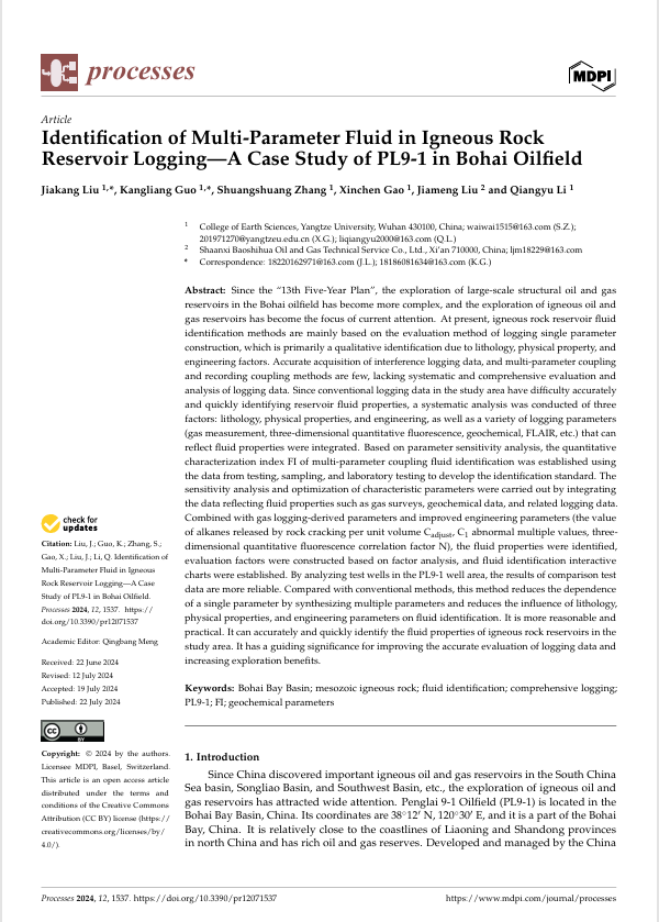 近日,060net永利地质资源与地质工程专业2022级硕士研究生刘佳康在中科院三区期刊《Processes》发表题为“Identification of Multi-Parameter Fluid in Igneous Rock Reservoir Logging—A Case Study of PL9-1 in Bohai Oilfield”的研究论文。060net永利为论文第一署名单位,刘佳康为论文第一作者,其导师郭康良(教授)为第一通讯作者。