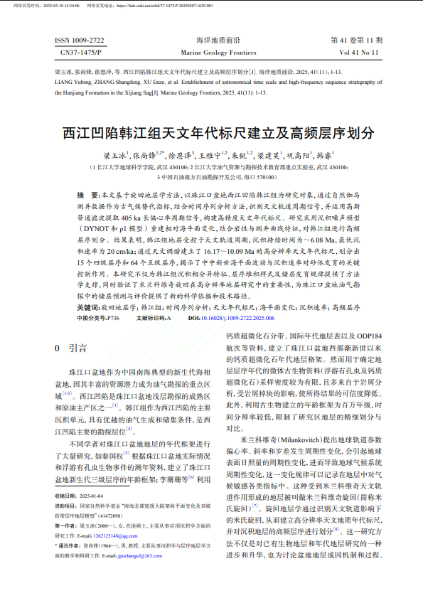 060net永利硕士生梁玉冰在《海洋地质前沿》发表题为“西江凹陷韩江组天文年代标尺建立及高频层序划分”的研究论文。060net永利为论文第一署名单位,通讯作者为张尚锋教授。