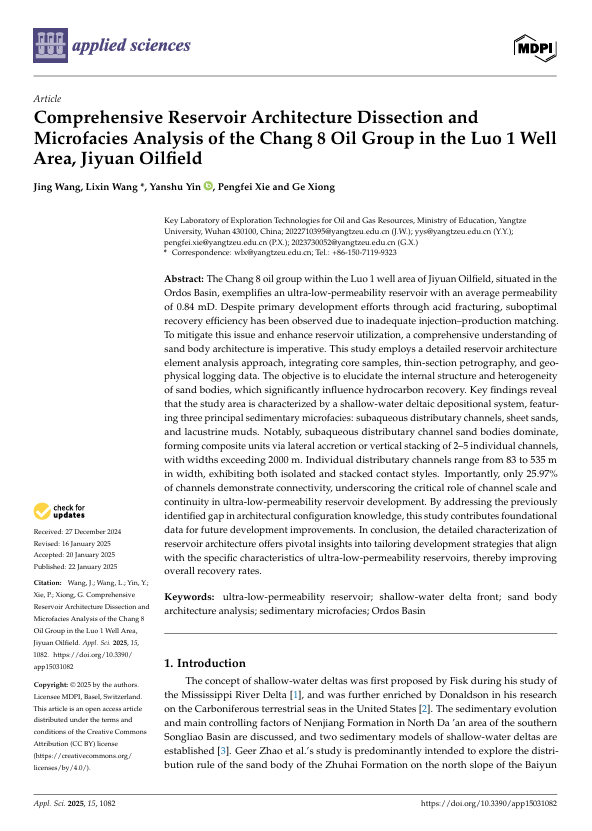 060net永利硕士生王婧在SCI收录期刊《Applied Sciences》上发表题为“Comprehensive Reservoir Architecture Dissection and Microfacies Analysis of the Chang 8 Oil Group in the Luo 1 Well Area, Jiyuan Oilfield”的研究论文。060net永利为论文第一署名单位,王立鑫老师为第一通讯作者。