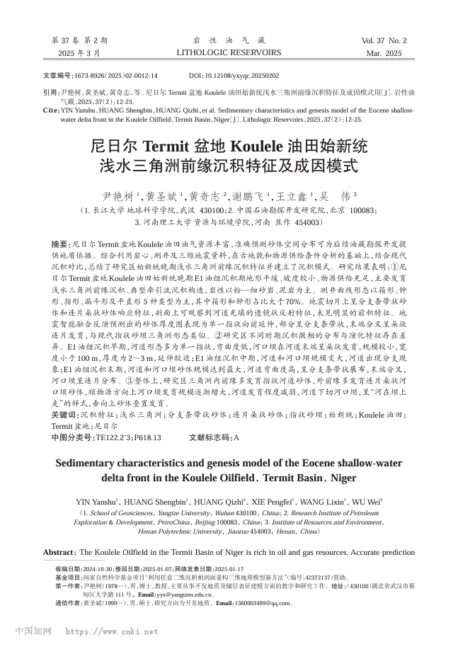 060net永利硕士研究生黄圣斌在期刊《岩性油气藏》上发表题为“尼日尔Termit盆地Koulele油田始新统浅水三角洲前缘沉积特征及成因模式”的研究论文。060net永利为论文第一署名单位,尹艳树教授为论文第一作者。