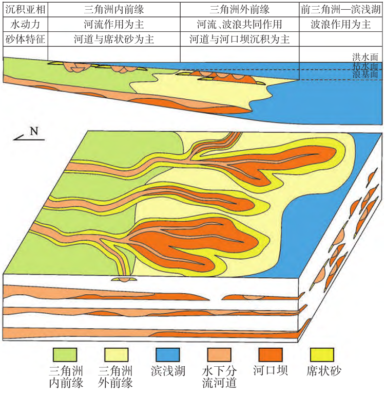 该研究综合利用岩心、测井及三维地震资料,在古地貌和物源供给条件分析的基础上,结合现代沉积对比,用基于智能融合地震属性的井震构型表征方法,精细刻画了研究区小层沉积微相,在沉积相分析的基础上,建立了研究区为指状砂坝型浅水三角洲沉积模式,该模式下的浅水三角洲内前缘、外前缘在不同位置上发育砂体类型不同,在内前缘以指状河道发育为主,外前缘河口坝发育程度高,在顺物源方向上水下分流河道的规 模逐渐减小,河口坝较多发育,河道下切于河口坝,砂体垂向叠置。
