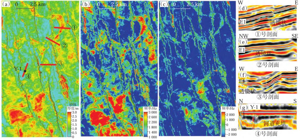 图1 尼日尔Termit盆地Koulele油田始新统E1-1小层地震属性切片和地震剖面特征