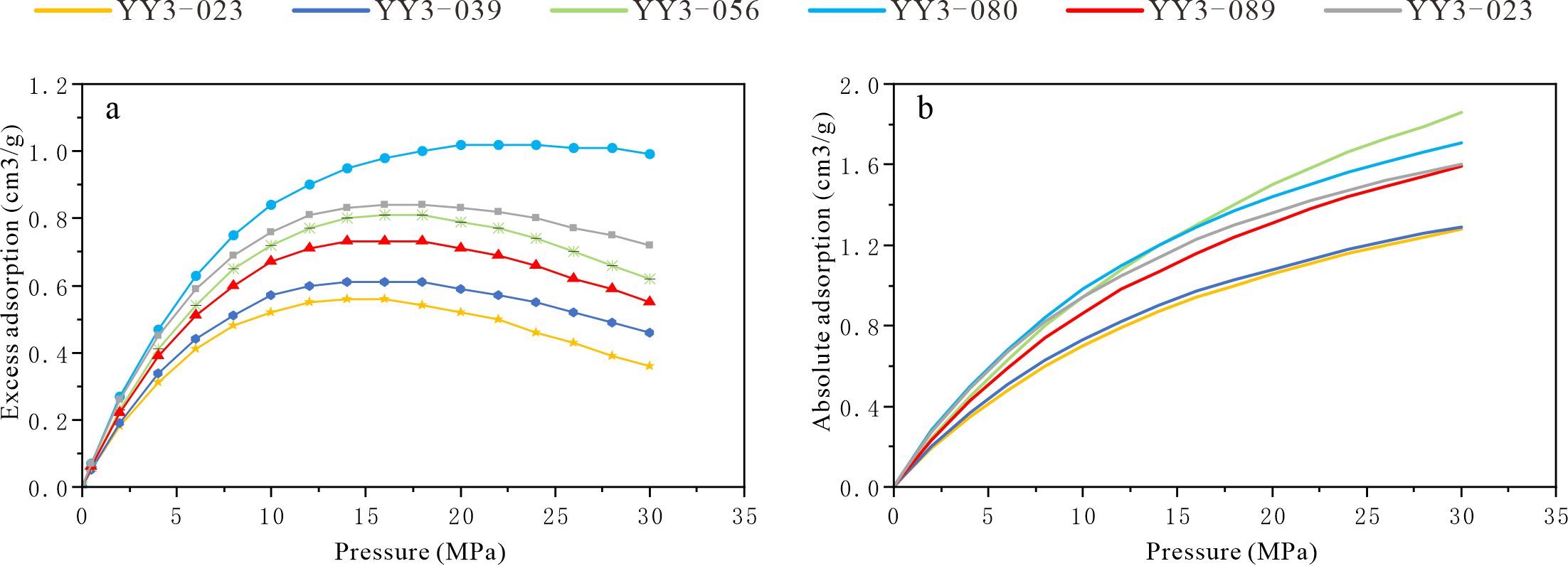 Figure 1.(a) Methane Excess Adsorption Data and Fitting Curve (358.15 K);(b) Methane Absolute Adsorption Curve (358.15 K).
