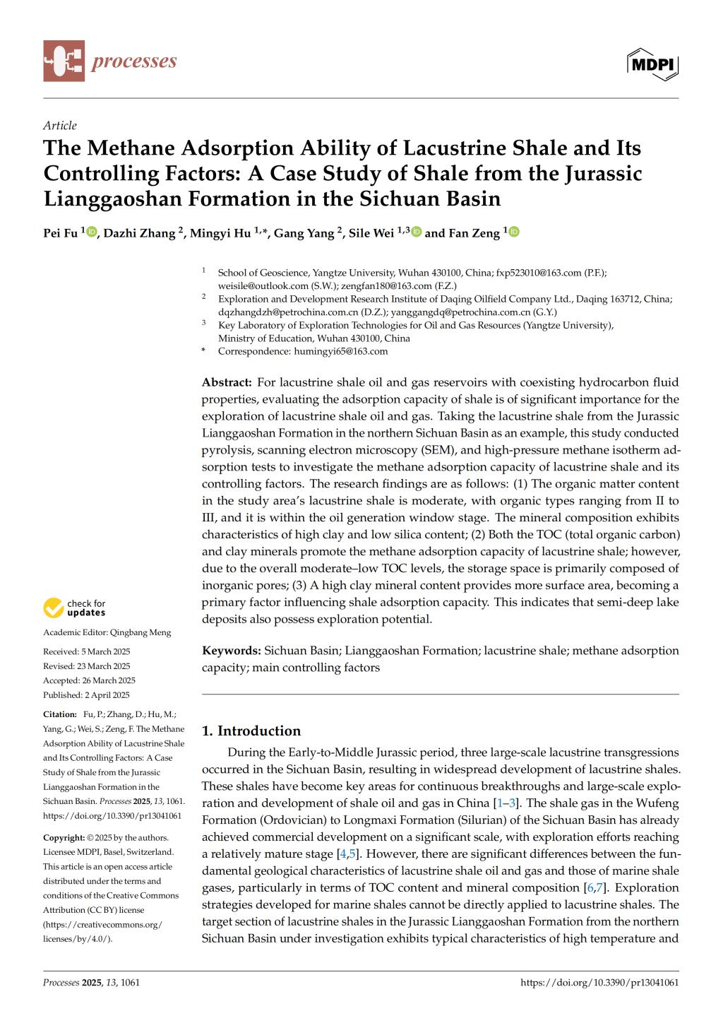 060net永利硕士生付沛在期刊《Processes》上发表了题为“The Methane Adsorption Ability of Lacustrine Shale and Its Controlling Factors: A Case Study of Shale from the Jurassic Lianggaoshan Formation in the Sichuan Basin”的研究论文。060net永利为论文第一署名单位,付沛为第一作者,其导师胡明毅教授为该文通讯作者。