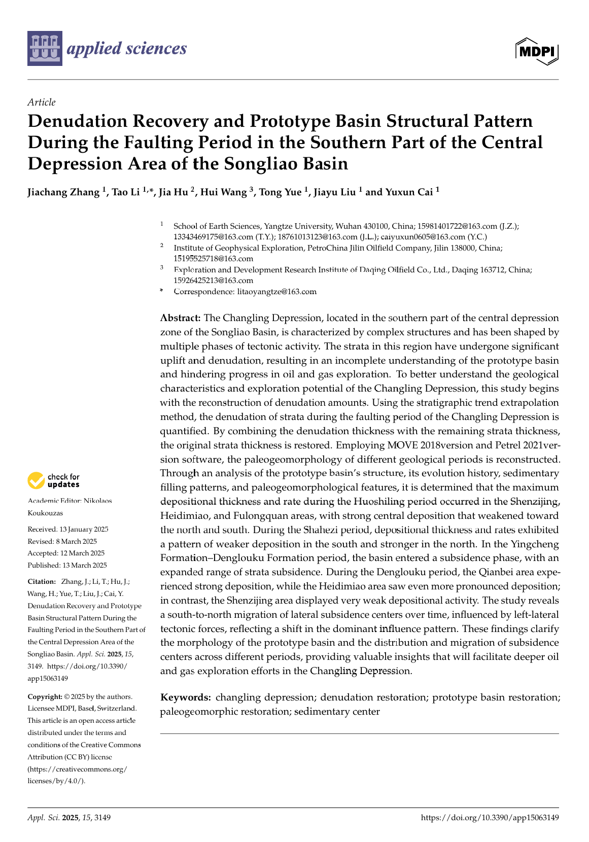 060net永利硕士研究生张珈畅在《applied sciences》上发表题目为“Denudation Recovery and Prototype Basin Structural Pattern During the Faulting Period in the Southern Part of the Central Depression Area of the Songliao Basin”的研究论文。060net永利为论文第一署名单位。研究生张珈畅为第一作者,李涛副教授为论文通讯作者。该研究从剥蚀量恢复入手,采用地层趋势外推法计算了长岭断陷断陷期地层的剥蚀量,恢复了原始地层厚度,重建了不同时期的古地貌。研究结果表明:火石岭期最大沉积厚度和沉积速率发生在中部神字井洼槽,向南北方向减弱;在沙河子期,沉积厚度和速率呈现出南弱北强的格局;营城组-登娄库组时期,地层沉降幅度加大,登娄库期乾北、黑帝庙地区沉积强烈,神字井地区逐渐减弱,横向沉降中心体现出由南向北迁移的迁移特征,明确了其受左旋作用的影响,这项研究将剥蚀恢复和古地貌学相结合,从而准确重建了长岭断陷的原型盆地形态,通过分析不同时期的沉降中心及分布规律,提出了洼槽差异性演化概念,解决了研究的局限性,建立了完善的地质框架,提高了长岭断陷的油气勘探战略精确性。