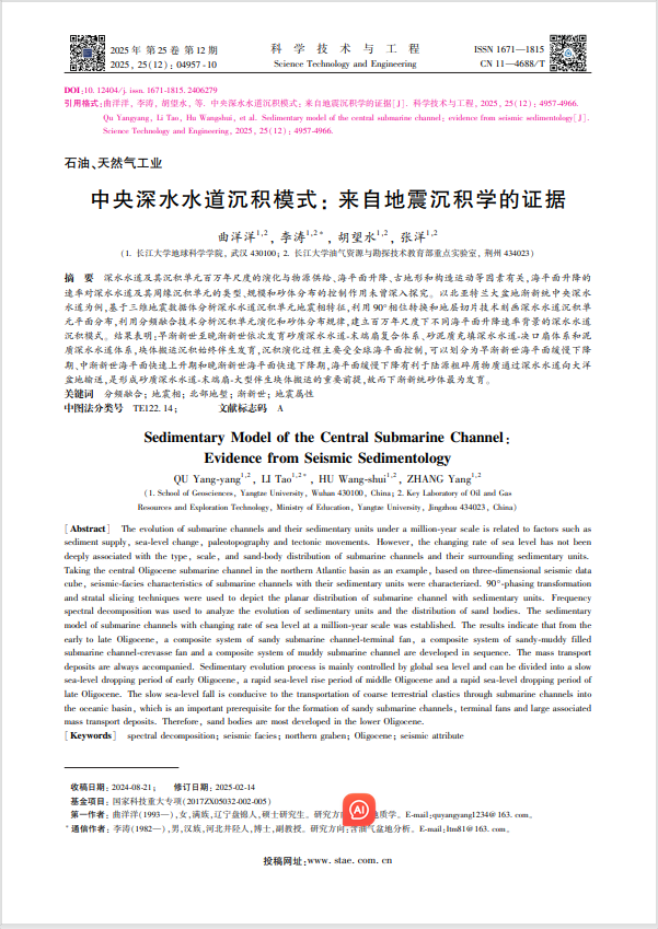 060net永利硕士生曲洋洋在《科学技术与工程》上发表题为“中央深水水道沉积模式—来自地震沉积学的证据”的研究论文。060net永利为论文第一署名单位,硕士生曲洋洋为论文第一作者,副教授李涛为通讯作者。