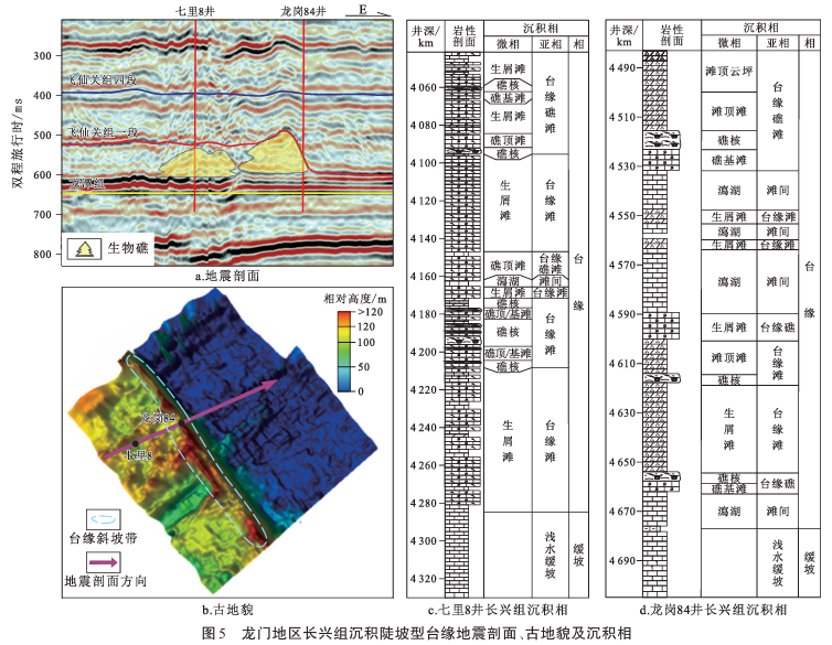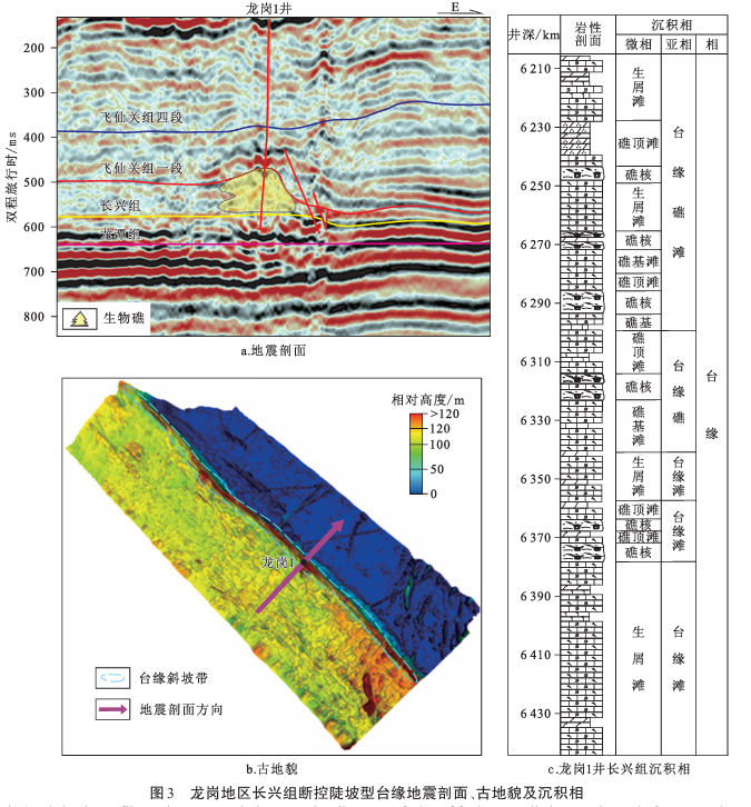 图1 龙岗地区长兴组断控陡坡型台缘地震剖面、古地貌及沉积相