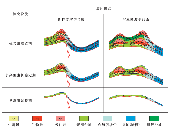 图3 开江—梁平海槽长兴组陡坡型台缘生物礁演化模式