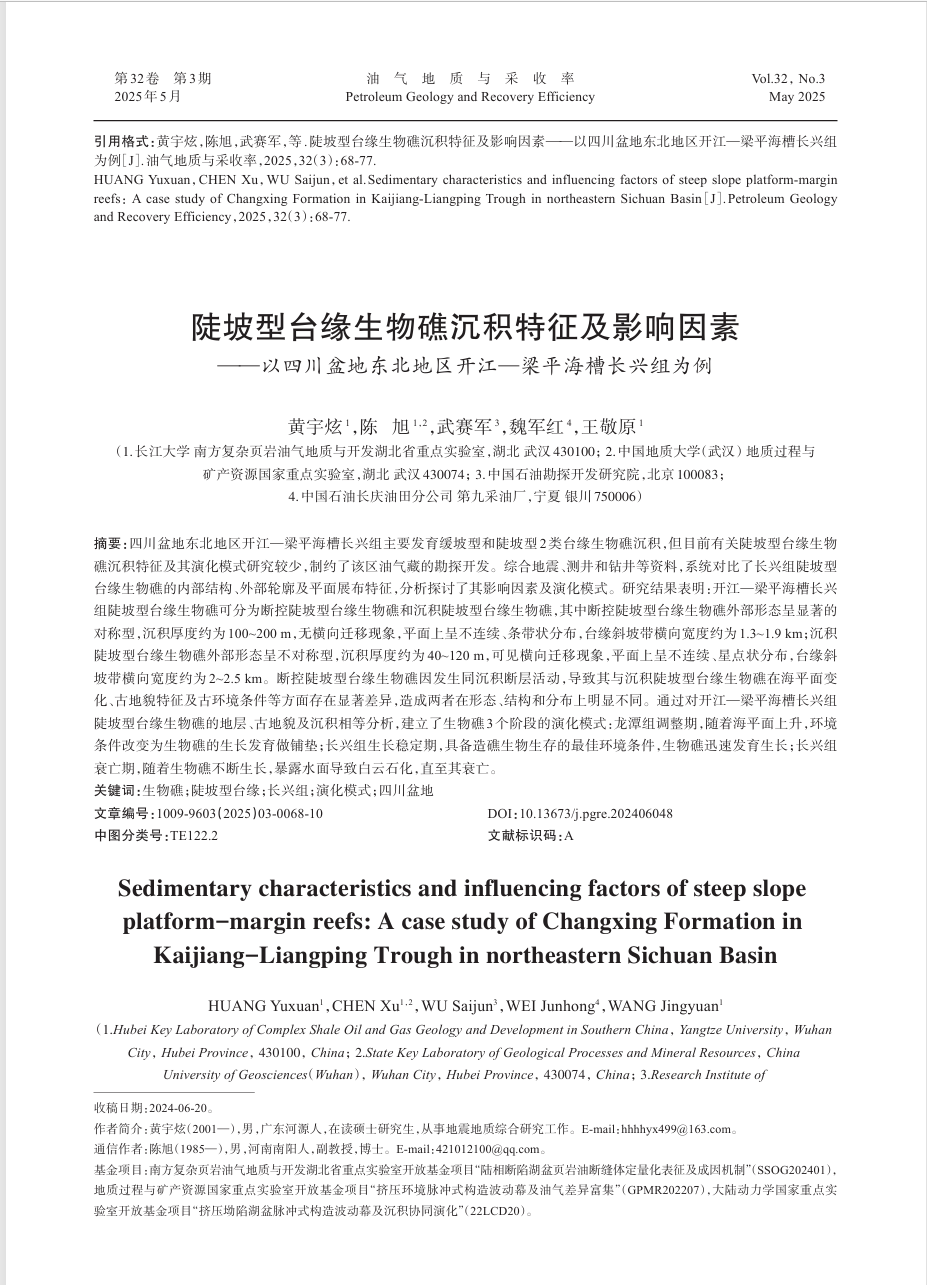 近日,060net永利地质学专业2024级硕士生黄宇炫在中文核心期刊《油气地质与采收率》发表题为“陡坡型台缘生物礁沉积特征及影响因素——以四川盆地东北地区开江—梁平海槽长兴组为例”的研究论文。060net永利为论文第一署名单位,硕士生黄宇炫为论文第一作者,其导师陈旭副教授为通讯作者。