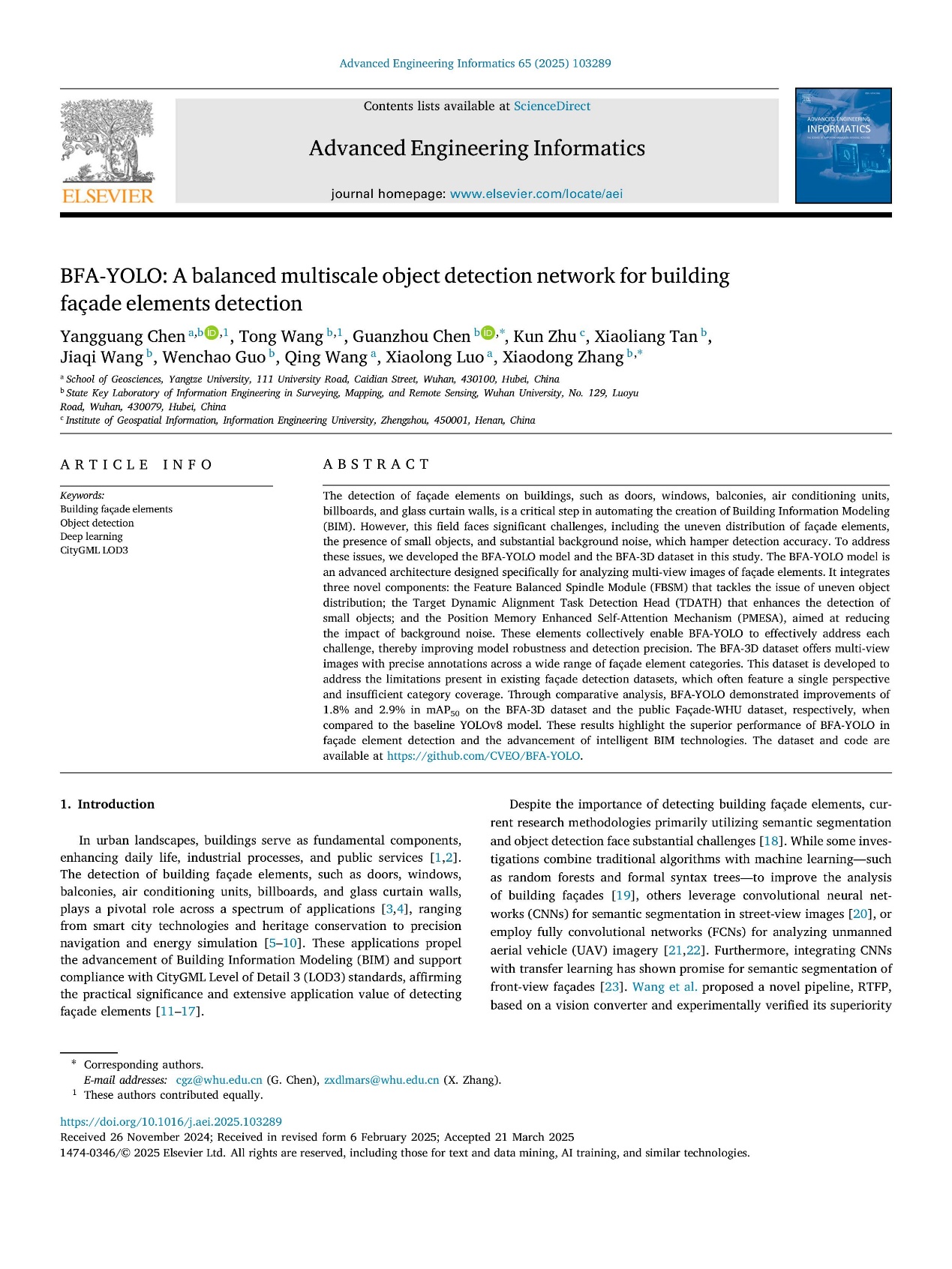 060net永利硕士生陈阳光在人工智能领域顶刊《Advanced Engineering Informatics》发表题目为“BFA-YOLO: A balanced multiscale object detection network for building façade elements detection”的研究论文(Sci一区Top,CCF-B,影响因子8.0)。060net永利为论文第一署名单位,硕士研究生陈阳光为论文第一作者,其导师罗小龙副教授为共同作者,公司兼职硕士生导师张晓东教授为通讯作者。