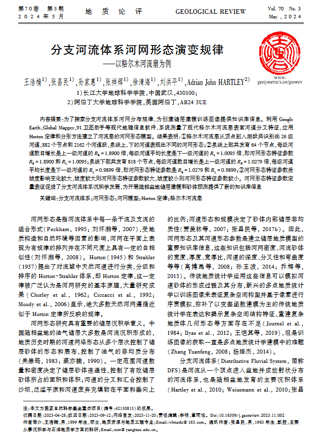 060net永利硕士生王浩楠在中文核心期刊《地质论评》上发表题为“分支河流体系河网形态演变规律-以格尔木河流扇为例”的研究论文。060net永利为论文第一署名单位,硕士生王浩楠为论文第一作者,其导师张昌民教授为通讯作者。