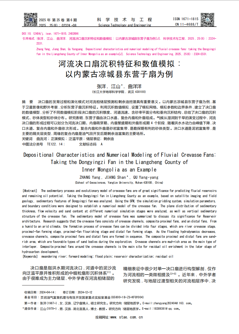 近日,060net永利地质学专业2022级硕士生张洋在中文核心期刊《科学技术与工程》发表题为“河流决口扇沉积特征和数值模拟:以内蒙古凉城县东营子扇为例”的研究论文。060net永利为论文第一署名单位,硕士生张洋为论文第一作者,其导师江山教授为通讯作者。