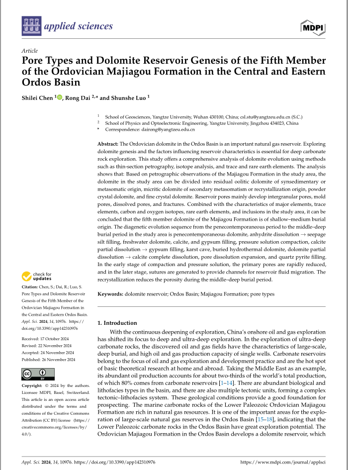 060net永利博士生陈世磊在《Applied Sciences》上发表题为“Pore Types and Dolomite Reservoir Genesis of the Fifth Member of the Ordovician Majiagou Formation in the Central and Eastern Ordos Basin”的研究论文。文章综合运用铸体薄片、碳酸盐岩碳氧同位素、、阴极发光、微量元素、稀土元素及流体包裹体等分析测试方法,并结合构造背景、沉积微相及成岩作用等资料,深入剖析白云岩的成因机理。分析表明,(1)受到海平面升降和中央古隆起的阻挡作用控制,研究区内奥陶系马家沟组五段膏盐下白云岩储层在短期海退和短期海进具有明显的差别,纵向上具有旋回性,依据研究区内大量马家沟组白云岩薄片镜下观察鉴定结果,研究区内白云岩可分为同沉积或交代成因的残余鲕粒白云岩,次生交代或重结晶成因的泥晶白云岩,粉晶白云岩和细晶白云岩。储层孔隙主要发育晶间孔、铸模孔、溶孔和裂缝。(2)马家沟组五段白云岩主要由准同生白云岩、埋藏白云岩及热液白云岩组成。根据地球化学特征结合岩石学特征,确定马家沟组五段白云石Sr含量平均值为407.3×10-6,具有低Fe、低Mn、高Sr、高Na的特点,稀土元素含量为0.01×10-6-21.8×10-6,具有典型碳酸盐岩低稀土元素含量特征,δ13C的含量介于-2‰-2‰之间δ18O的含量介于-12‰到-4‰之间,说明其成岩环境为埋藏环境。(3)研究区内从准同生期到中-深埋藏期的成岩演化序列为:准同生白云石化、硬石膏溶解→渗流粉砂充填、淡水白云化、方解石和石膏充填、压溶压实作用、方解石部分溶解→石膏充填、溶缝溶孔溶洞、埋藏热液白云化、白云石部分溶蚀→方解石完全溶蚀、孔隙溶蚀扩大、石英黄铁矿充填。其中压实压溶作用早期使原生孔隙迅速减少,后期则产生缝合线等为储层流体运移提供通道;重结晶作用则在中-深埋藏期使孔隙减少。