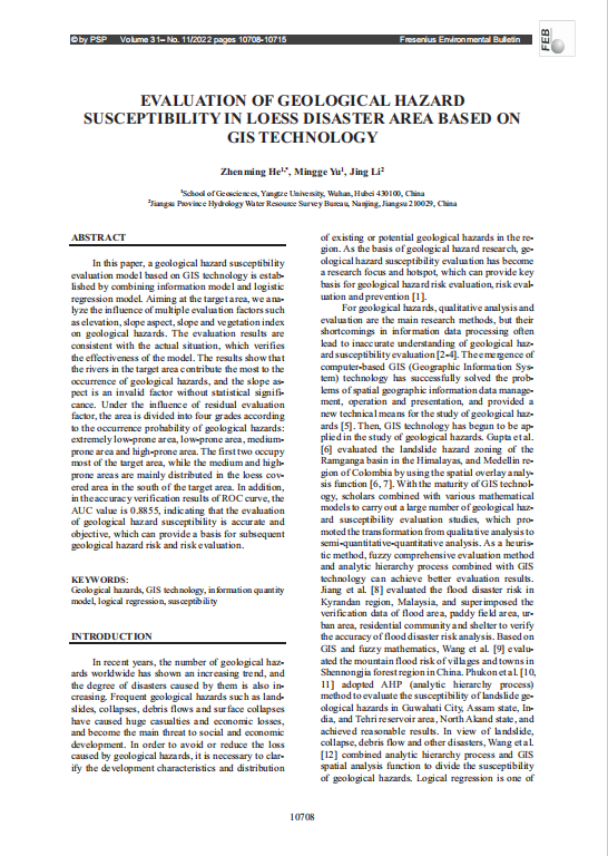 060net永利研究生于茗鸽以第二作者身份在环境科学领域SCI期刊《Fresenius Environmental Bulletin》上发表了题为“EvaluationofGeologicalHazardSusceptibilityinLoessDisasterAreaBasedonGISTechnology”的研究论文。该论文以永利官网为第一署名单位,060net永利副教授何贞铭为第一作者,研究生于茗鸽为第二作者。