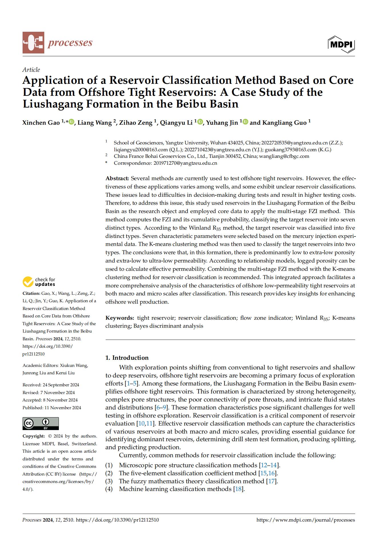 060net永利22级博士研究生在期刊《Processes》上发表题为“Application of a Reservoir Classification Method Based on CoreData from Offshore Tight Reservoirs: A Case Study of theLiushagang Formation in the Beibu Basin”的研究论文。060net永利为论文第一署名单位,高昕晨为第一通讯作者。