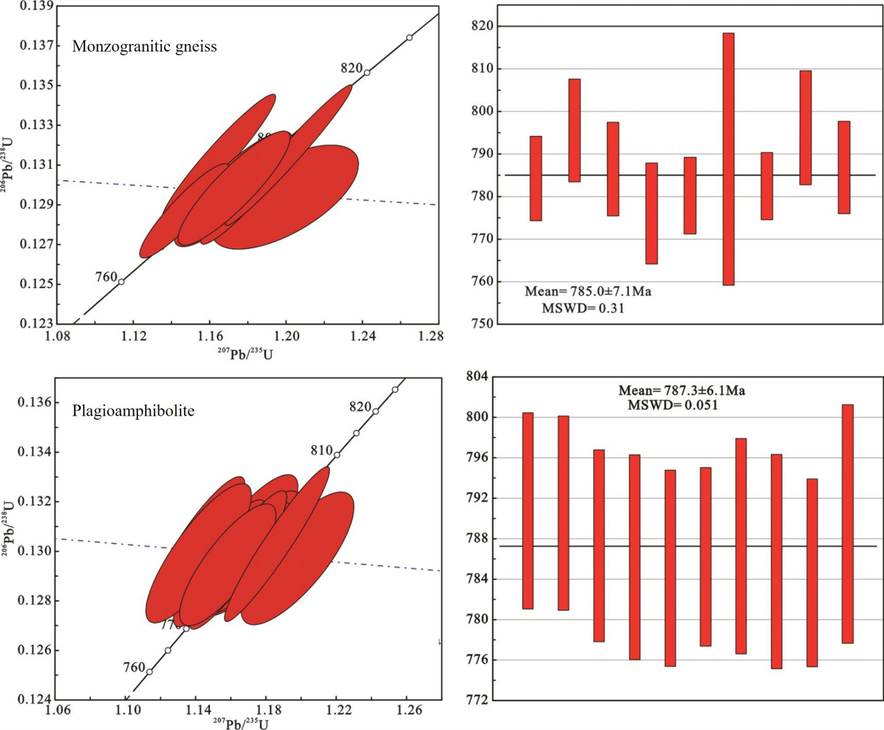 图1.大别造山带新元古代双峰式侵入岩锆石U-Pb谐和年龄图及加权平均年龄图