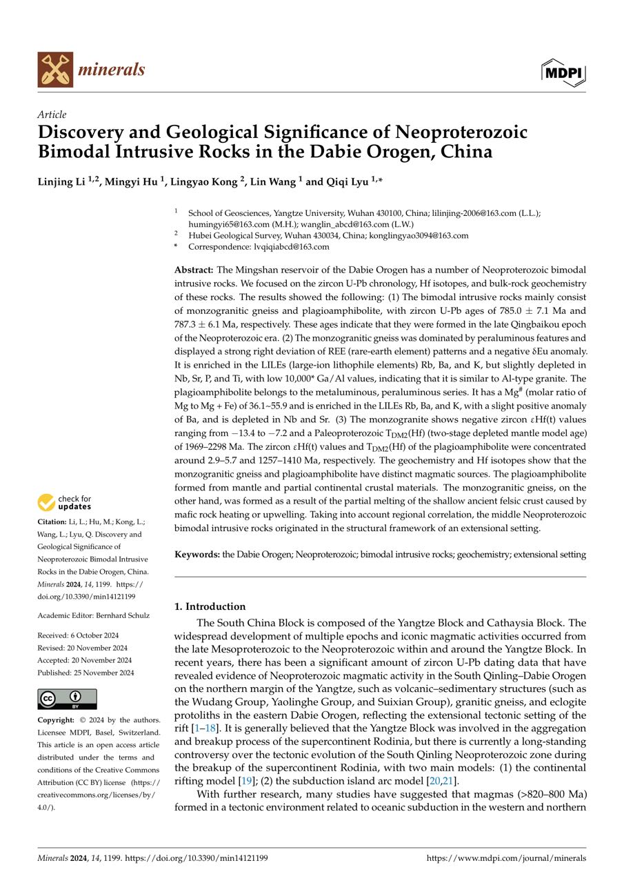 060net永利地质系胡明毅教授团队长期从事地质学方向的研究。团队成员李琳静博士在期刊《Minerals》上发表题为《Discovery and Geological Significance of NeoproterozoicBimodal Intrusive Rocks in the Dabie Orogen, China》的研究论文,060net永利为论文第一署名单位,博士生李琳静为论文第一作者。
