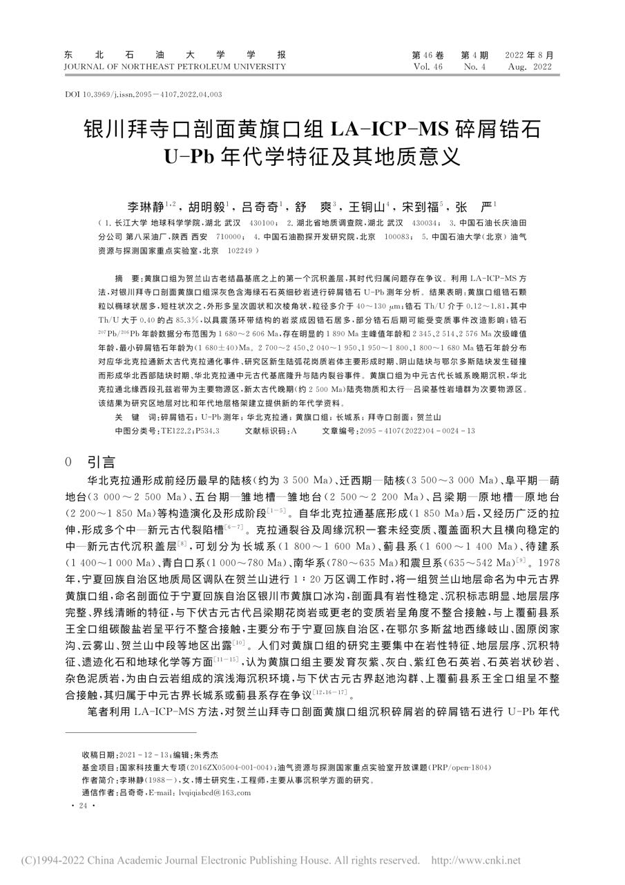 论文利用LA-ICP-MS方法,对银川拜寺口剖面黄旗口组深灰色含海绿石石英细砂岩进行碎屑锆石U-Pb测年分析。