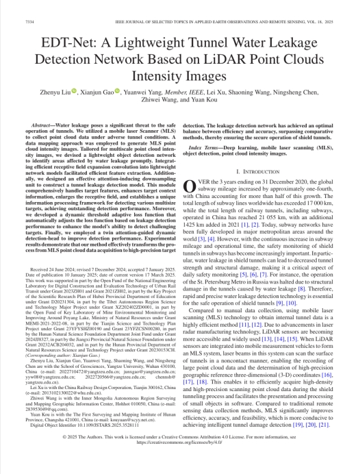 060net永利研究生刘振宇以第一作者身份在SCI期刊《IEEE Journal of Selected Topics in Applied Earth Observations and Remote Sensing》上发表题为“EDT-Net: A Lightweight Tunnel Water Leakage Detection Network Based on LiDAR Point Clouds Intensity Images”的研究论文,060net永利为论文第一署名单位,研究生刘振宇为第一作者,副教授高贤君为论文通讯作者。